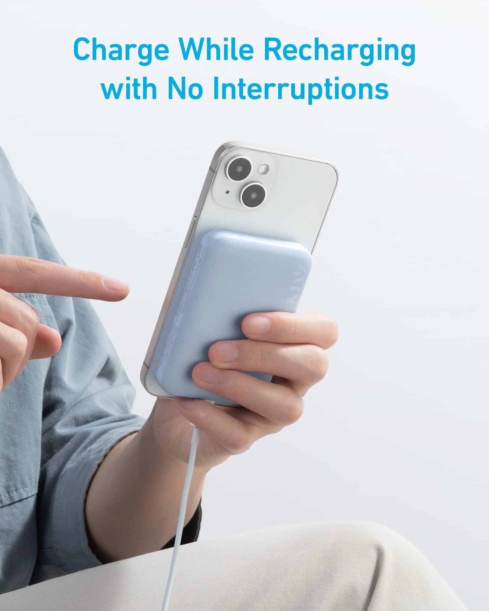 Seamlessly charge your iPhone while Anker 321 Magnetic Battery is recharging, eliminating the need to wait for the power bank to be fully charged before using it.