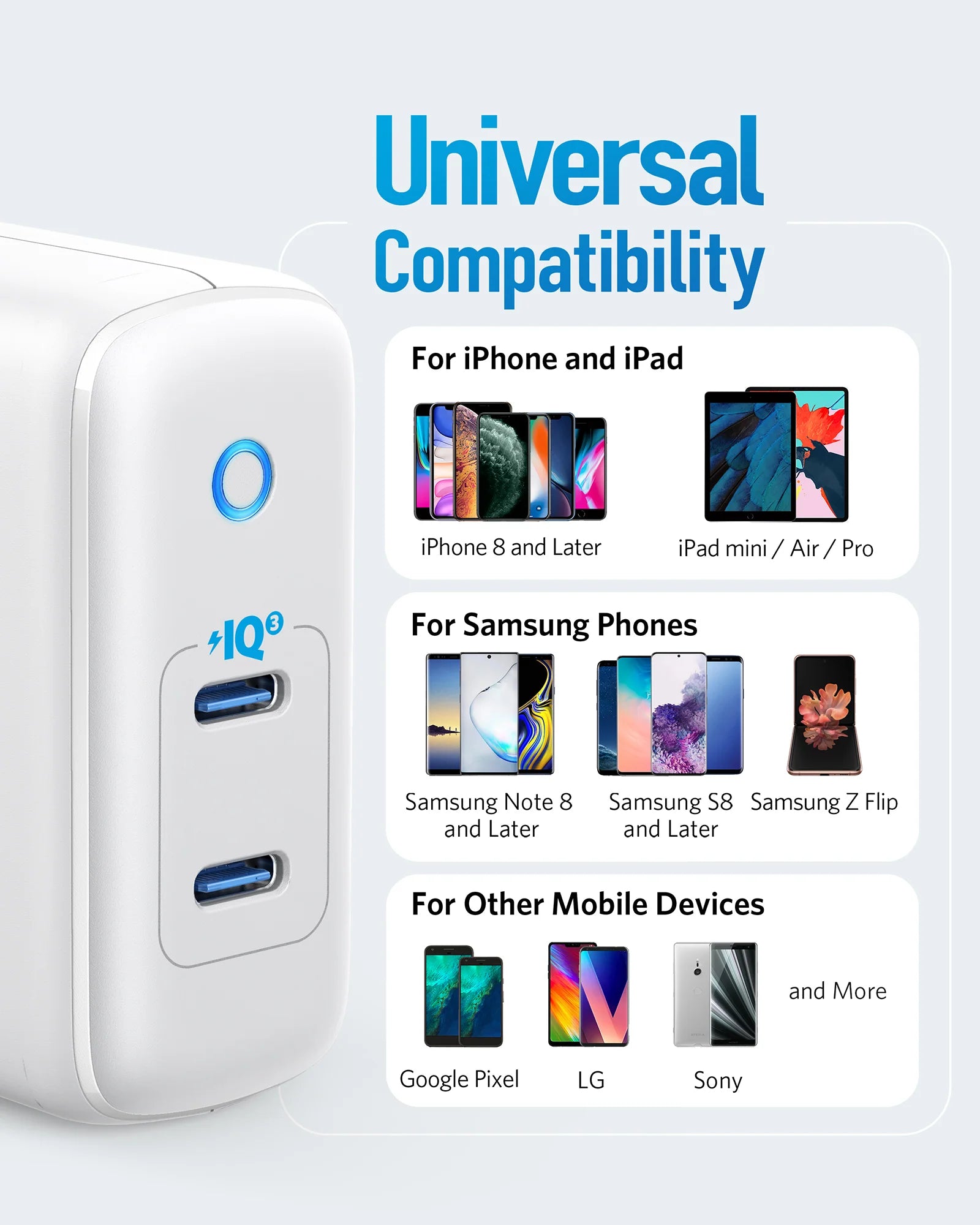Our exclusive PowerIQ 3.0 technology provides optimized charging to virtually any device. Supports Qualcomm Quick Charge and USB-C Power Delivery for phones, tablets, and more.
