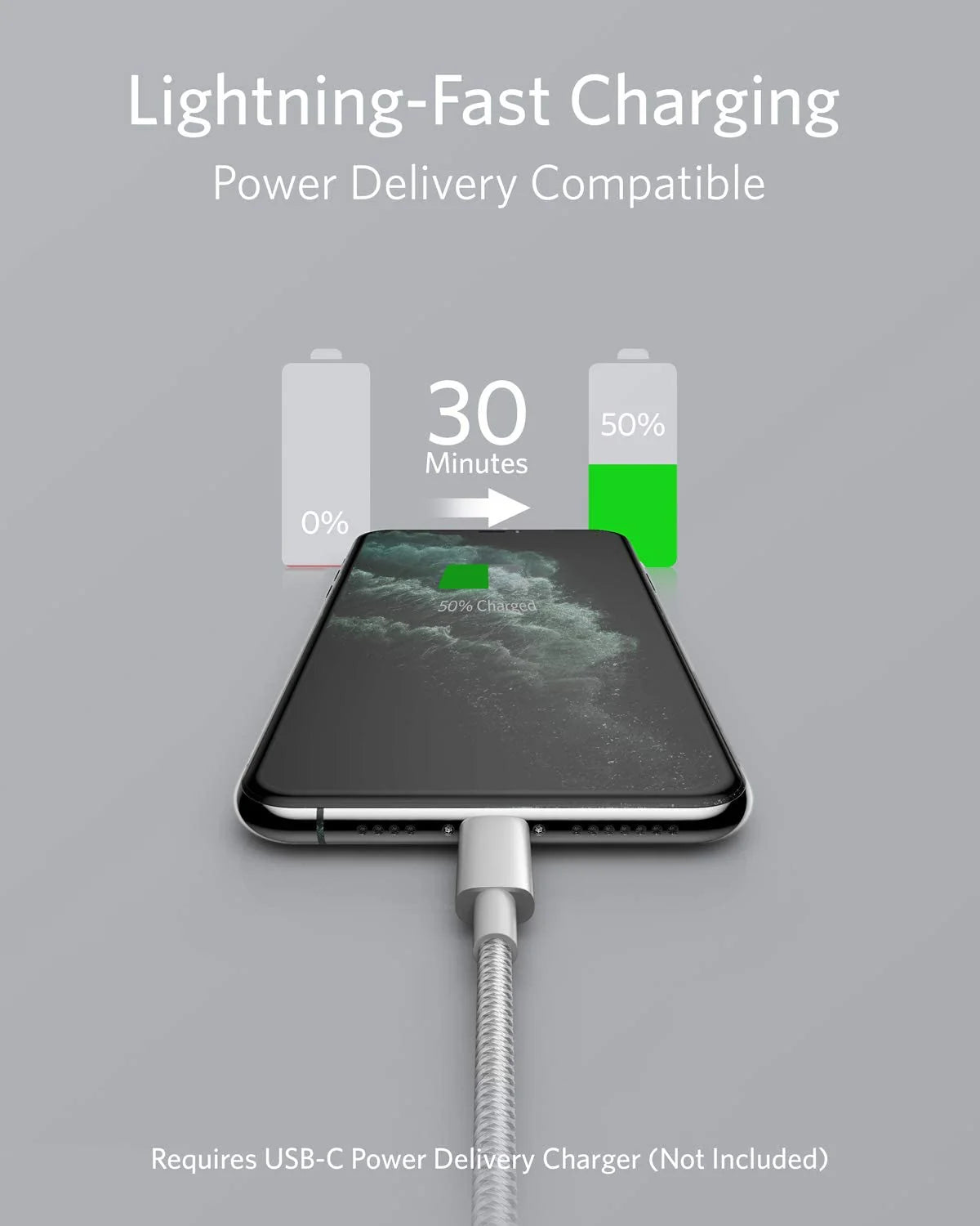 Supports a maximum output of 60W, allowing for high-speed charging to iPhone and iPads. Pair up with an 18W Power Delivery charger to charge your iPhone up to 50% in just half an hour. (Charger Not Included)