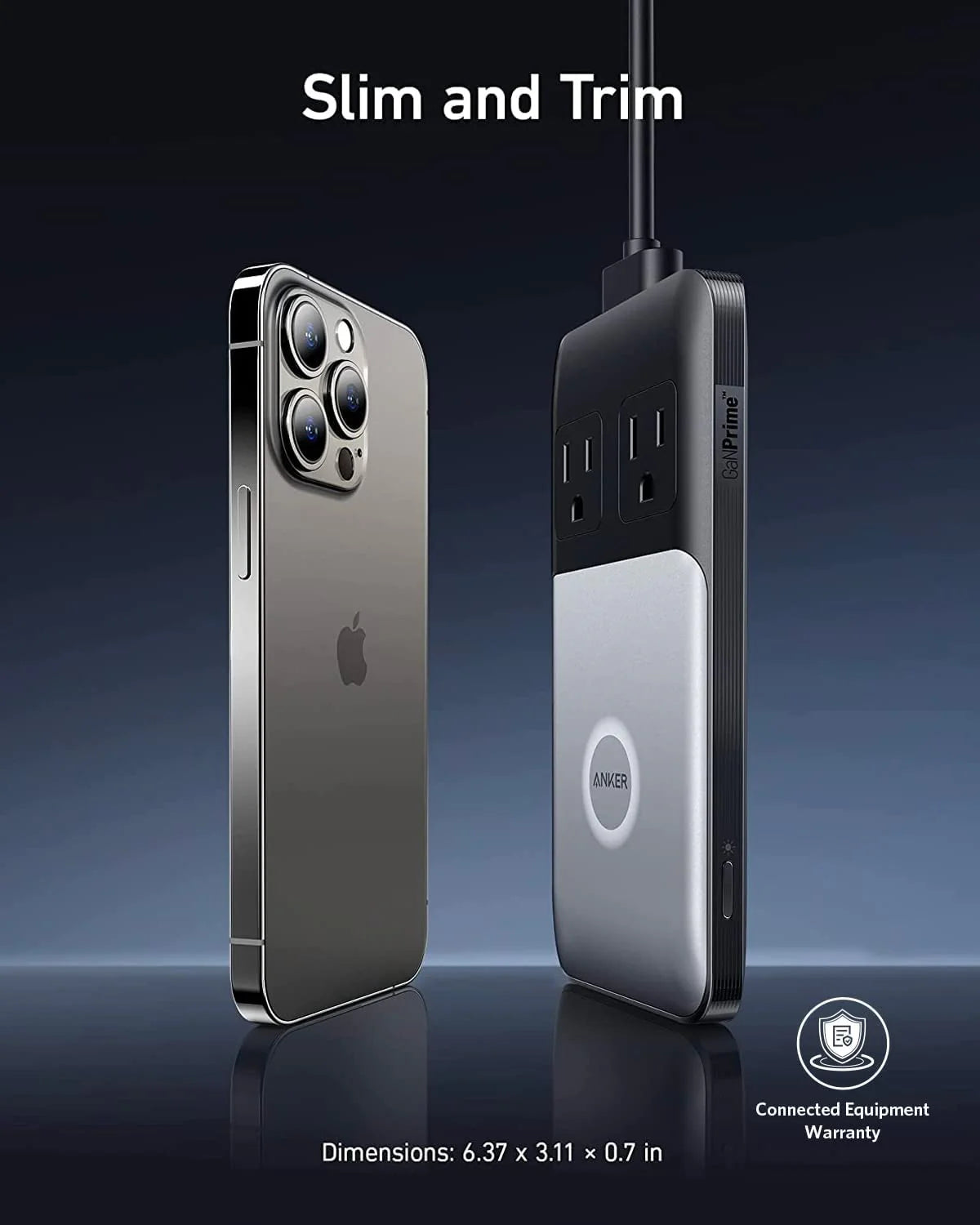 At only 0.7 inches thick, the power strip is about the size of an iPhone 13 Pro Max and can fit comfortably in your palm or pocket—ideal to bring on a trip.