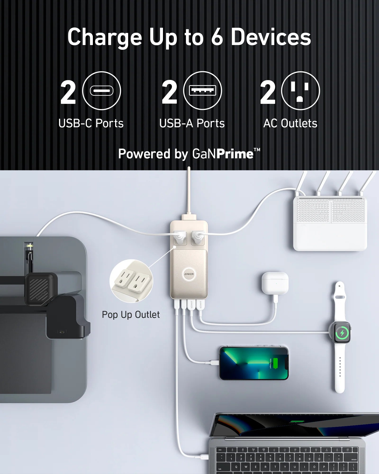 2 USB-C ports, 2 USB-A ports, and 2 AC outlets allow you to charge 6 devices at the same time.