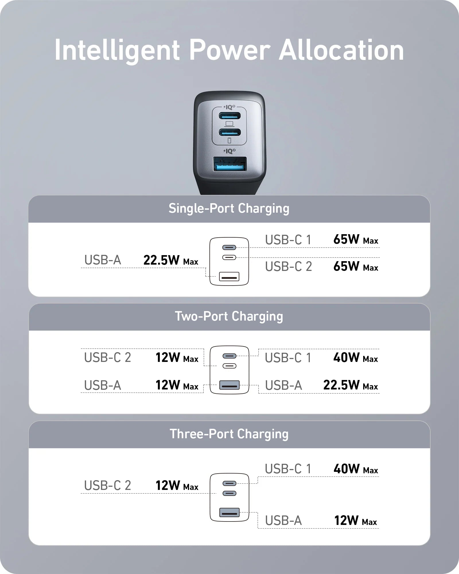 Triple Port: USB-C 1 (40W Max), USB-C 2 (12W Max), USB-A (12W Max)