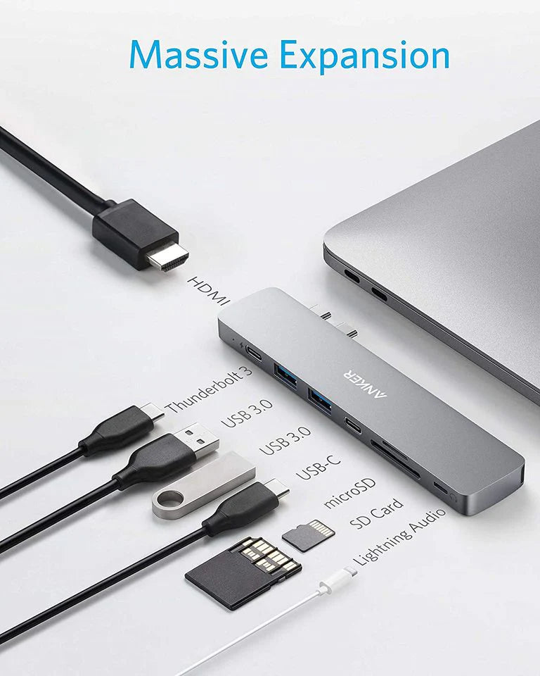 Expand your MacBook’s 2 USB-C ports into 1 Thunderbolt USB-C port, 1 USB-C data port, 2 USB-A ports, 1 HDMI port, 1 SD card slot, 1 microSD card slot, and a Lightning audio port—all from one ultra-compact hub.