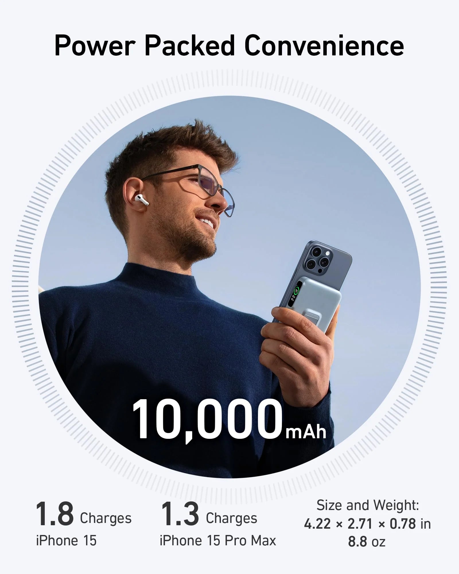 With a powerful 10,000mAh, secure 1.8 charges for your iPhone 15 Pro and enjoy hands-free viewing with the built-in stand.