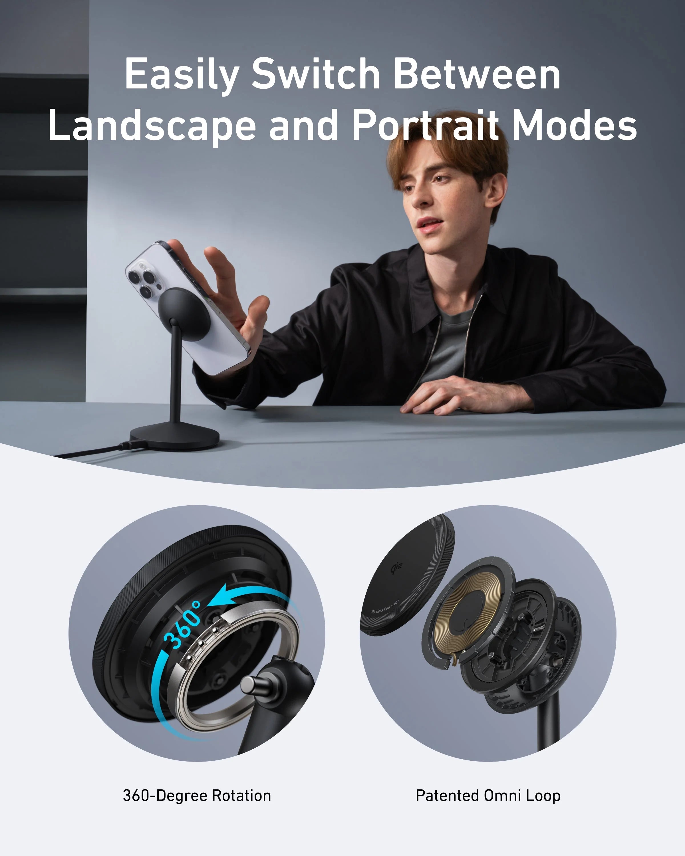 The wireless charger features a patented 360° rotating mechanism for seamless orientation changes and an adjustable tilt for the perfect viewing angle.