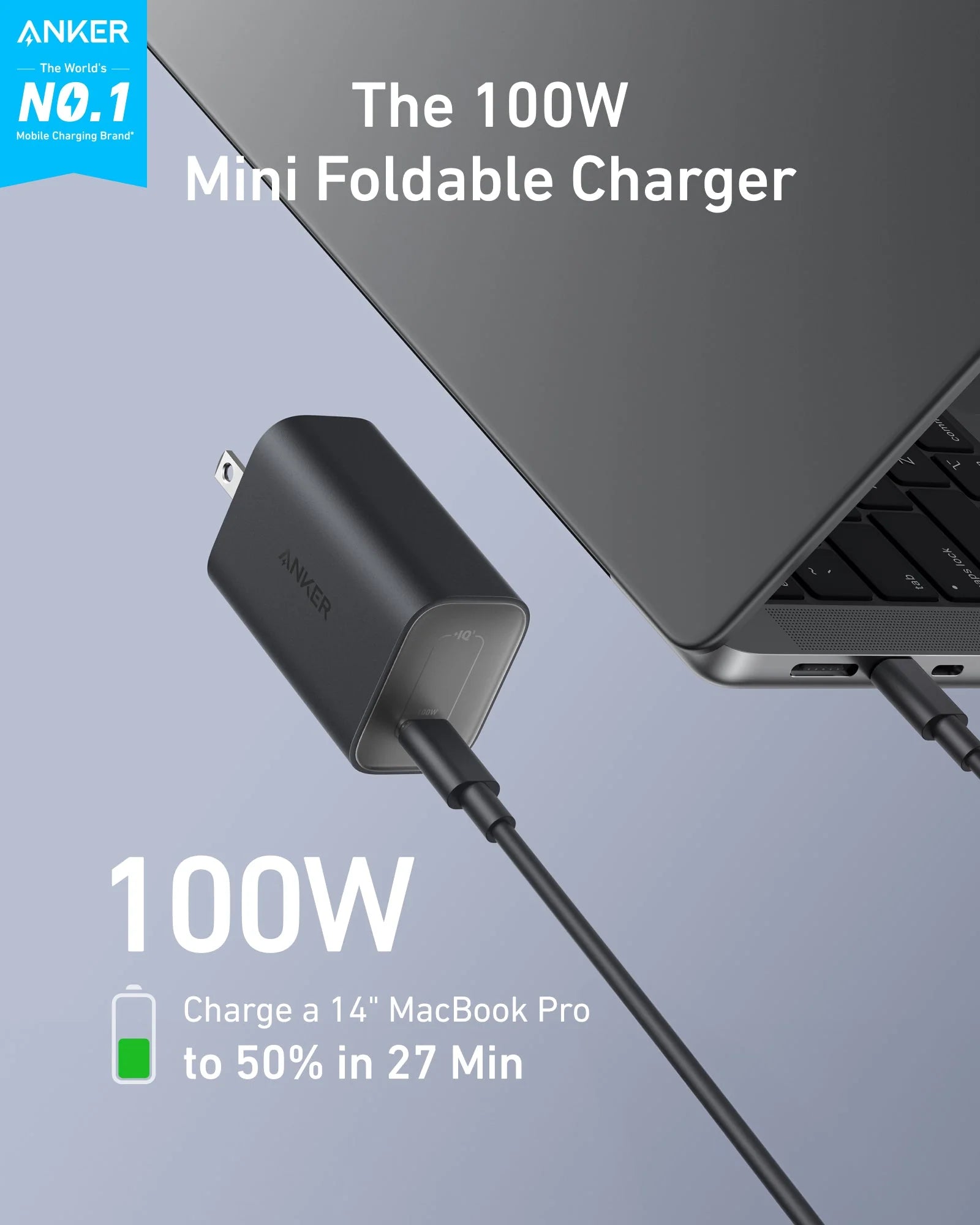 This remarkably compact charger delivers massive 100W power, quickly charging your 14-inch MacBook Pro to 50% in just 27 minutes. (Note: Tested under ideal lab conditions. Actual charging times may vary with usage, environment, and device status.)