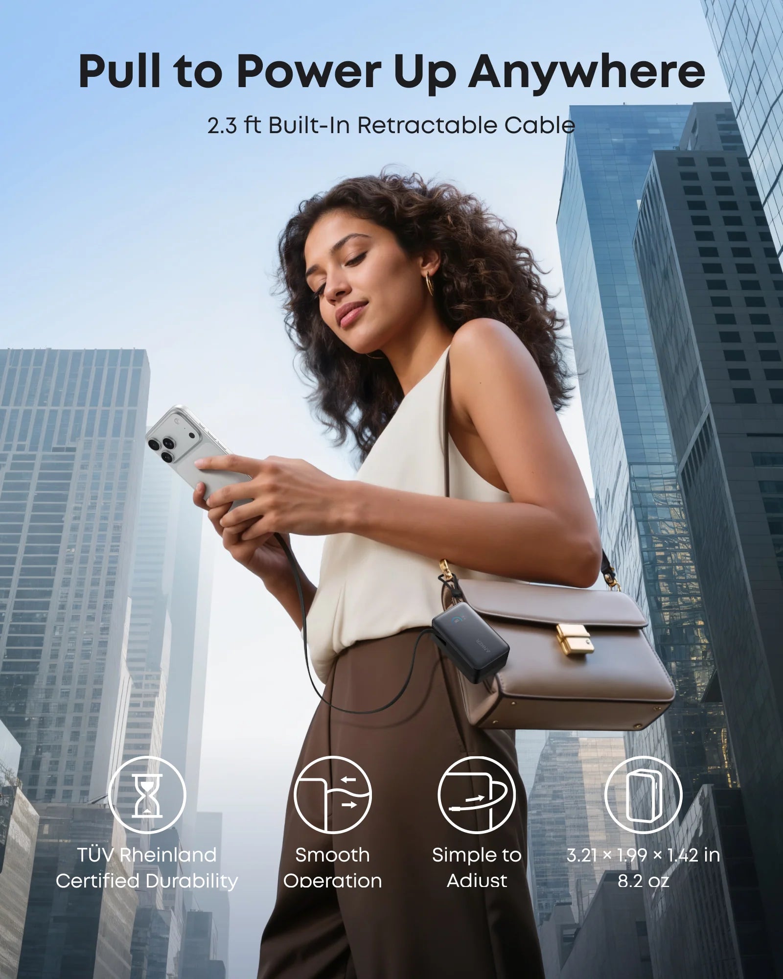 Seamlessly power up with a pull of the durable, built-in retractable cable, capable of over 20,000 bends. Charge neatly and efficiently without the hassle of tangled wires.