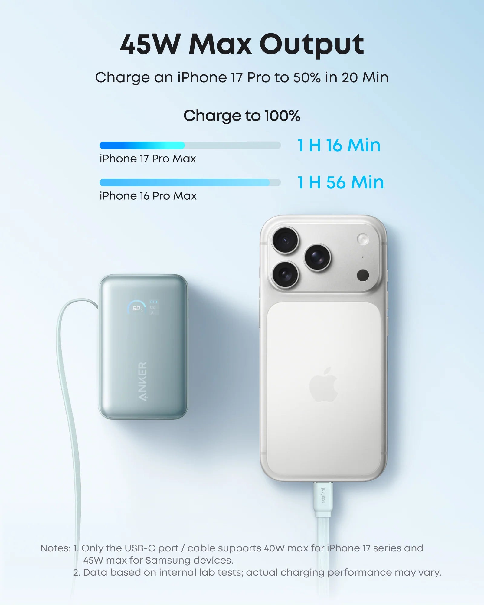 Enjoy simultaneous charging and recharging with a 45W max single-port USB-C output for devices and a 30W max input for quick power bank replenishment. Charge an iPhone 17 Pro to 50% in 20 minutes and recharge the power bank to 100% in 2 hours.