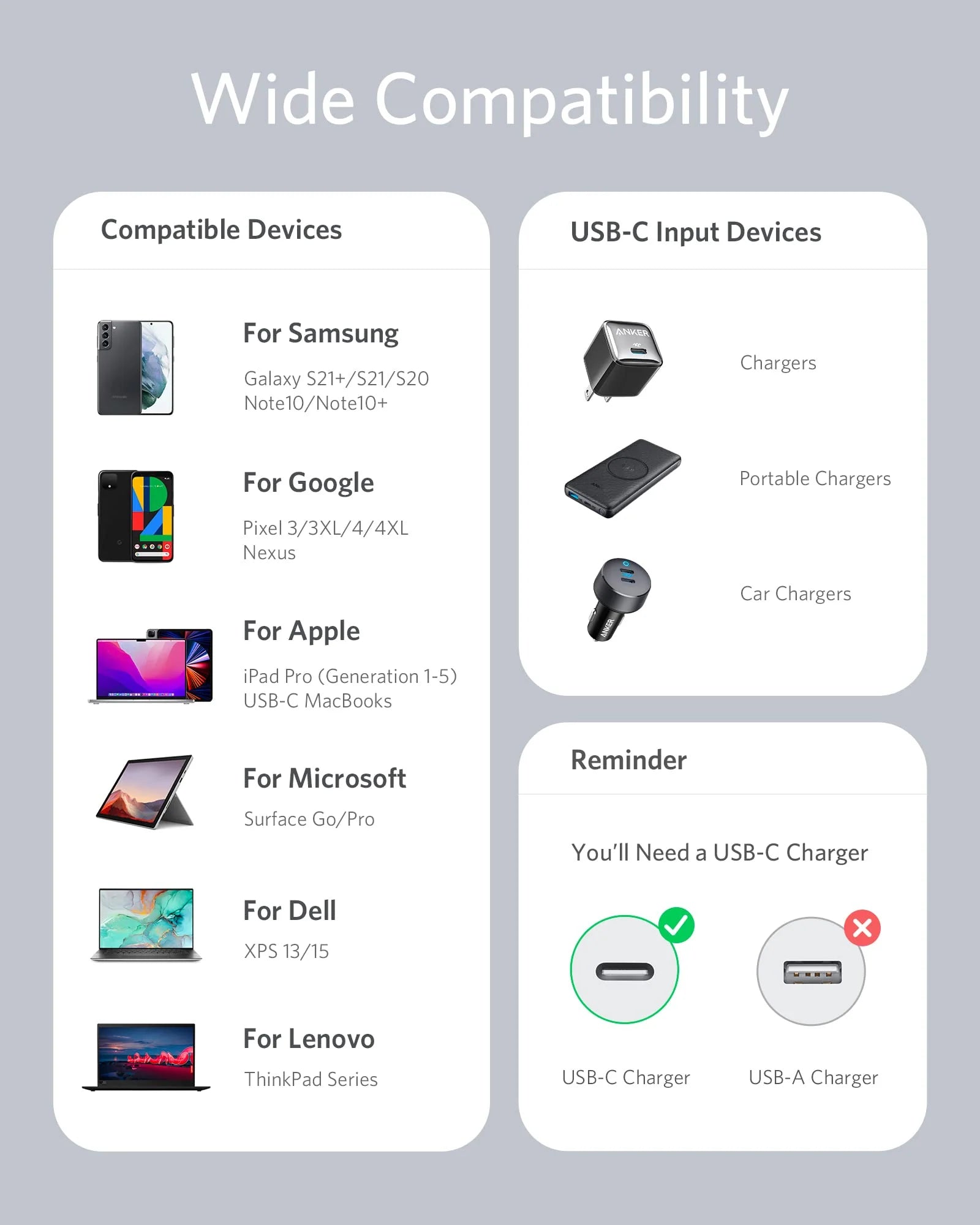 Supports a max power output of 100W when paired with a 100W or above wall charger to power up virtually any USB-C device, including phones, tablets, and laptops. (This cable does not support media display.)