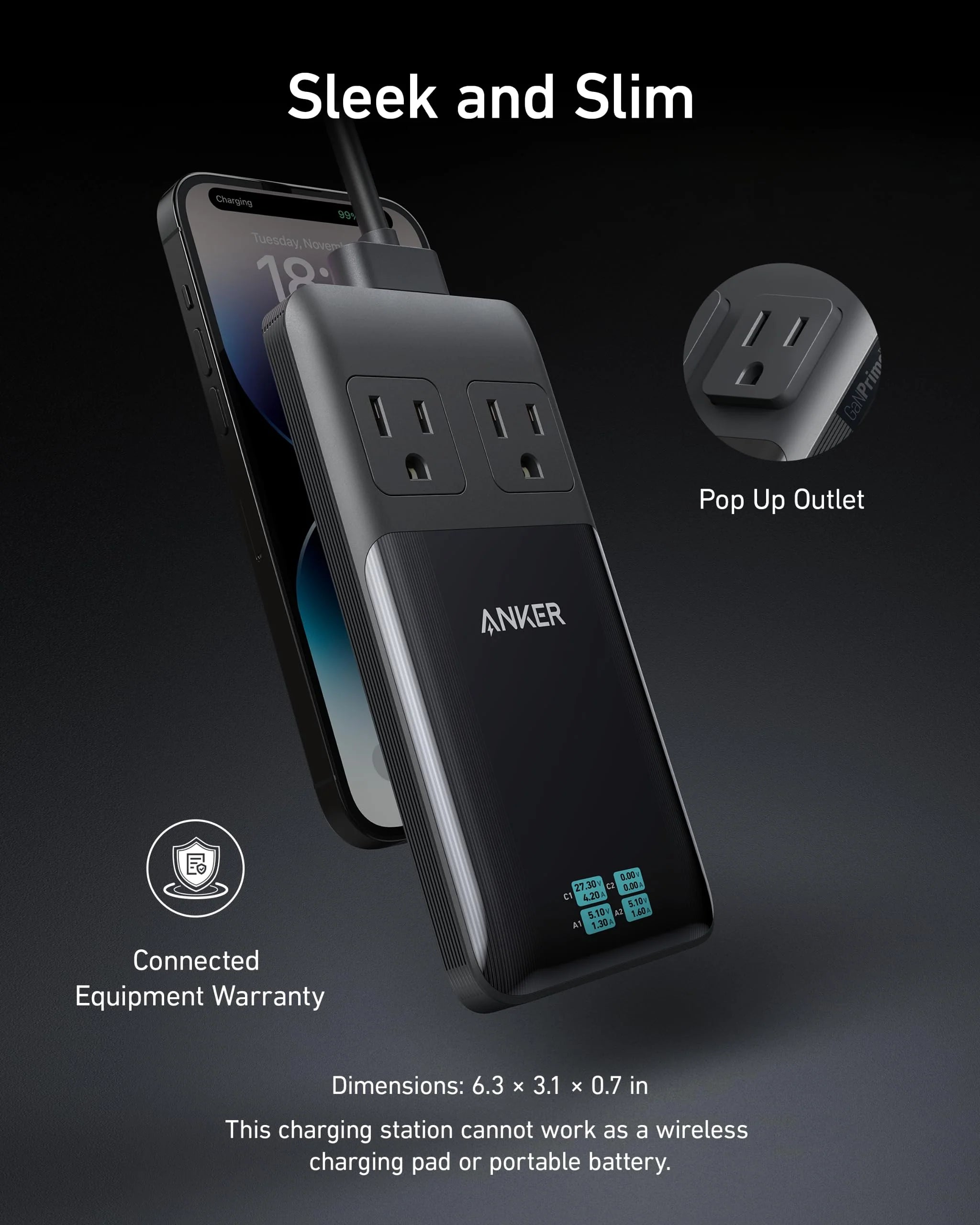 Designed with Anker's innovative stacked design with a pop-up outlet, this power strip is incredibly slim at just 0.7 inches thick, making it easy to carry in your bag or backpack.
