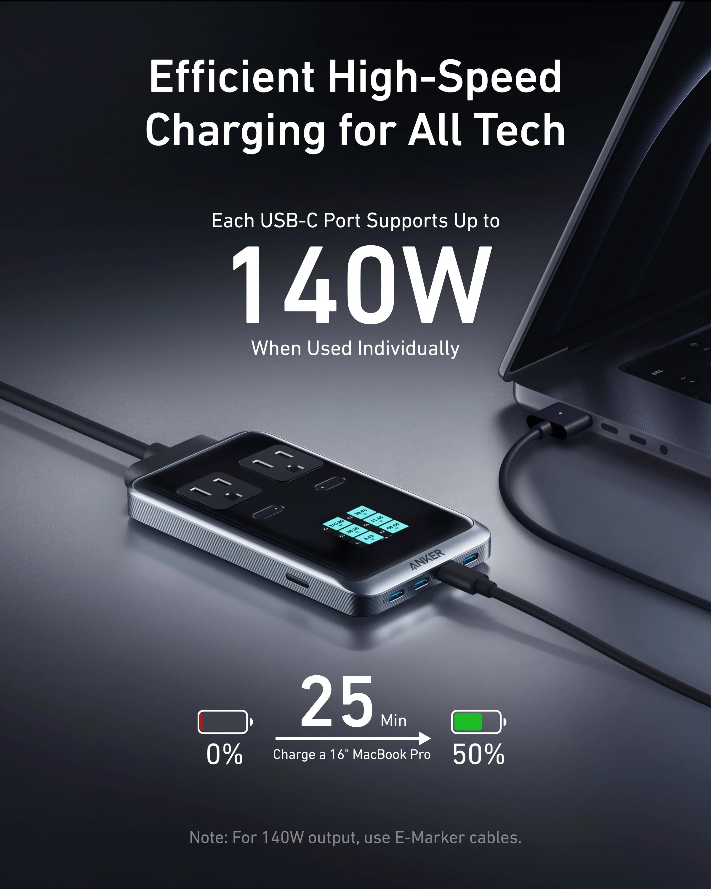 Leverage the 140W output available on each USB-C port to rapidly charge your high-demand devices such as a 16-inch MacBook Pro, efficiently reaching 53% in just 30 minutes.