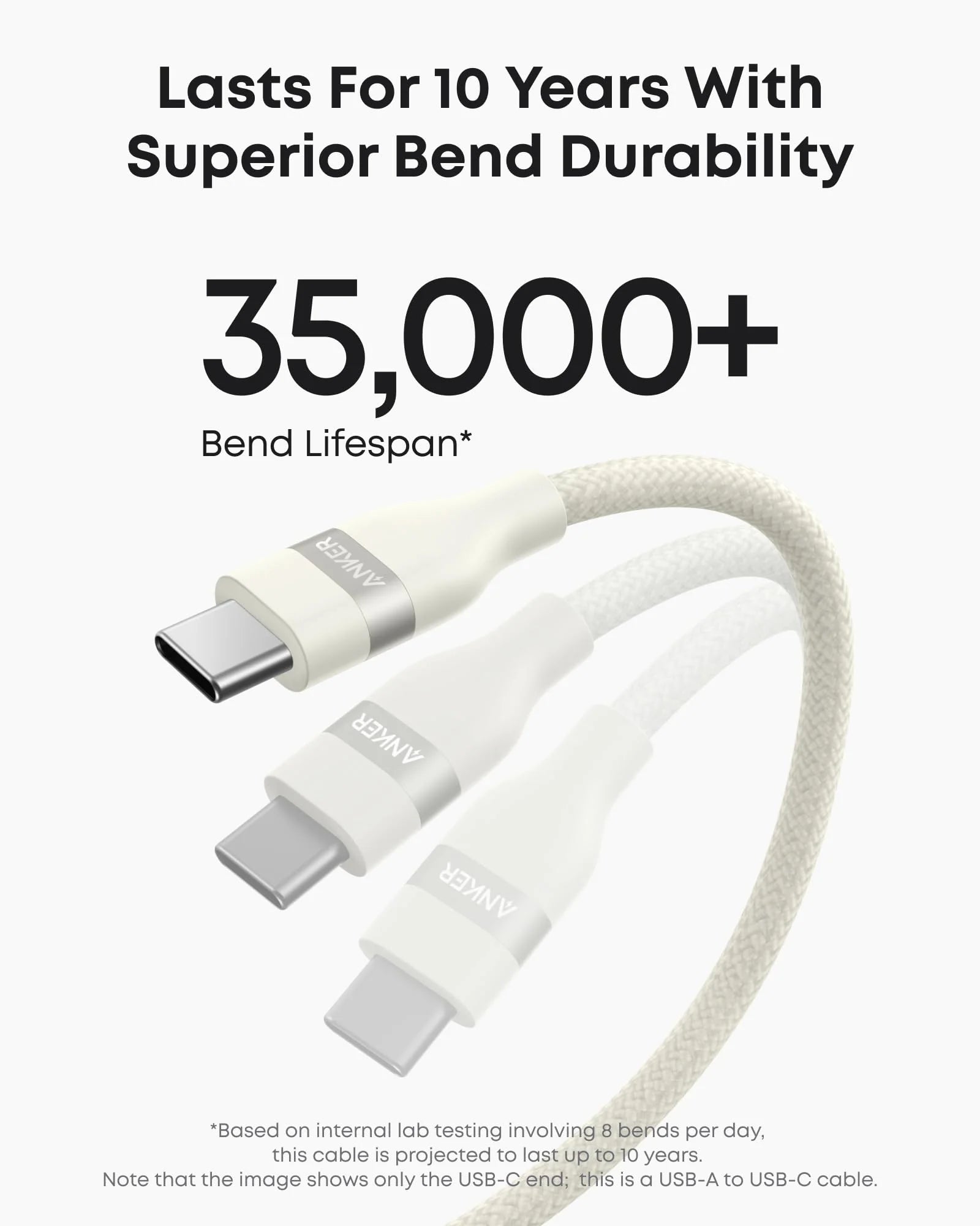 Engineered to withstand over 35,000 cycles, offering up to 10 years of bend durability. (Note: Based on internal lab testing involving 8 bends per day, this cable is projected to last up to 10 years.)